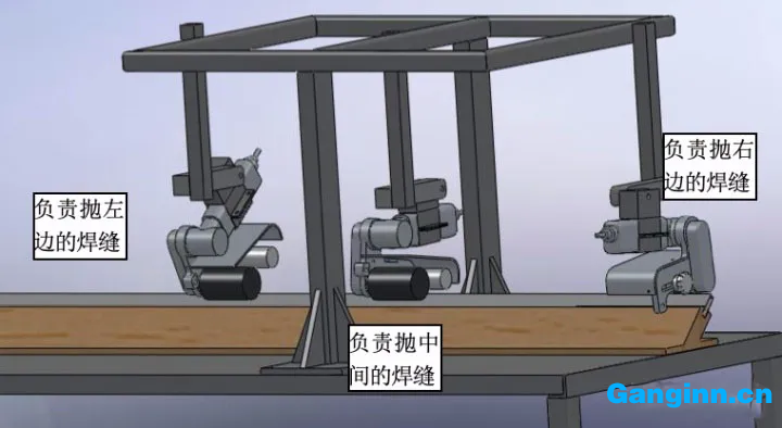 九個研磨拋光機(jī)平面圖:三個砂帶機(jī)做為一個工藝流程(一組)打磨拋光三個面,具體工作上,后一組砂帶機(jī)的打磨拋光部位需比前一組砂帶機(jī)的打磨拋光部位前行1-1.5毫米,此設(shè)計方案是為了更好地后邊一組研磨拋光機(jī)能更強的打磨拋光掉前一組留有的打磨拋光的劃痕。