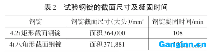 Cr12Mo1V1屬萊氏體鋼, 鑄鋼件冷疑全過程中, 脫溶產生共晶反映產生魚骨頭狀的萊氏體沿位錯網絡狀凝結, 鑄鋼件的冷疑速率越快, 初凝越少, 鑄鋼件的晶體細微, 則共晶滲碳體網細微 [3] 。依據鑄鋼件凝結的平方米根基本定律, 即鑄鋼件凝結層薄厚(S/mm)與初凝(t/min) 的平方根正相關, 公式計算為:S=Kt 1/2 , 式中K為凝結指數, 一般為5毫米/min 1/2[4] , 實驗鑄鋼件的橫截面規格及按計算公式的初凝如表2所顯示。由表2能夠看得出, 4.2t矩形框橫截面鑄鋼件的橫截面總面積與4t八角形橫截面鑄鋼件的橫截面總面積非常 (二者橫截面總面積之比0.98) , 但4.2t鑄鋼件的初凝則較短, 是4t鑄鋼件的0.6倍。不難看出, 4.2t鑄鋼件的晶體要細于4t鑄鋼件, 共晶滲碳體網還要細于4t鑄鋼件, 表明4.2t矩形框橫截面鑄鋼件比4t八角形橫截面鑄鋼件便于得到 細的共晶滲碳體網。