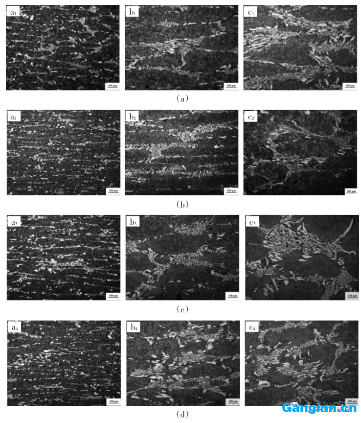 實驗方式 :各自沿鍍鋅扁鋼截面直線1/4處和園鋼截面直徑1/4處割除金相分析試件, 經碾磨、 打磨拋光、 4%氰化鈉酒精溶液浸蝕后, 依據B/T14979-1994 《鋼的共晶碳化物不均勻度評定法》 規范中第四定級圖對實驗鋼的共晶滲碳體不圴勻度開展鑒定及剖析。