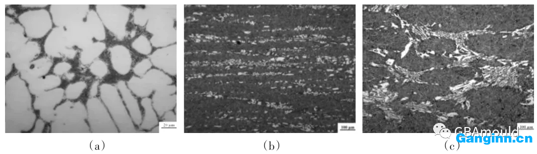 Cr12Mo1V1鑄鋼件經熱處理后, 如圖所示1a所顯示的鑄鋼件鍛造態網狀結構共晶滲碳體沿形變方位呈帶條狀或網狀結構延伸, 形變充足時呈帶條狀如圖所示1b所顯示, 形變不充足時網絡狀如圖所示1c所顯示。實驗鍍鋅扁鋼和園鋼的共晶滲碳體如圖2所顯示, 按GB/T14979-1994規范中第四定級圖鑒定的共晶滲碳體不勻稱度級別如表3所顯示。