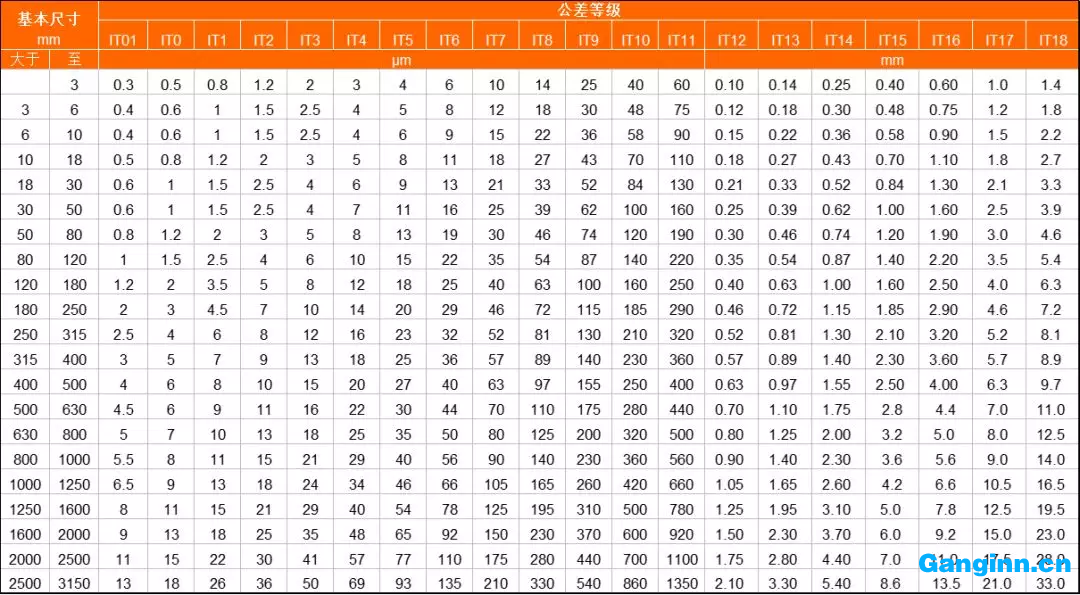 公差等級表就是指明確規格精準水平的級別,國家標準要求分成20個級別,從IT01、IT0、IT1、IT2~IT18, 數據越大,公差等級表(加工精度)越低,規格容許的變化范疇(尺寸公差標值)越大,生產加工難度系數越小。